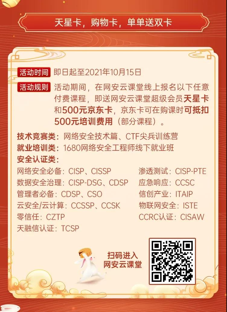 ÎÞÂÛÄúÊÇÍøÂçÇå¾²´ÓÒµÕß¡¢Ï²»¶Õߣ¬£¬£¬£¬Õվɼ´½«ÂõÈëÍøÂçÇå¾²ÐÐÒµµÄ½áÒµÉú£¬£¬£¬£¬»òÊÇÏëҪתÐдÓÊÂÍøÂçÇå¾²µÄС°×£¬£¬£¬£¬Ö»ÒªÄúÓÐÌáÉý×Ô¼º×¨ÒµÊÖÒÕµÄÐèÇ󣬣¬£¬£¬µã»÷Éó²éÄúÐèÒªµÄ¿Î³Ì£¬£¬£¬£¬ÎÒÃÇËæÊ±´ýÃü£¡Ô˶¯Ê±´ú£¬£¬£¬£¬ÔÚÍø°²ÔÆ¿ÎÌÃÏßÉϱ¨Ãû²¿·Ö¸¶·Ñ¿Î³Ì£¬£¬£¬£¬¼´ËÍÍø°²ÔÆ¿ÎÌó¬µÈ»áÔ±ÌìÐÇ¿¨ºÍ500Ôª¾©¶«¿¨£¬£¬£¬£¬¾©¶«¿¨¿ÉÔÚ¹º¿Îʱ¿ÉµÖ¿Û500ÔªÅàѵÓöȣ¨²¿·Ö¿Î³Ì£©¡£¡£¡£¡£¡£