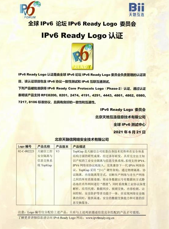 ¿ËÈÕ£¬£¬£¬£¬×¯ÏÐÓÎÏ·¹¤¿ØÇå¾²¸ôÀëÓëÐÅÏ¢½»Á÷ϵͳ£¨TopIGap£©È¡µÃIPv6 Ready LogoÈÏÖ¤Ö¤Ê飬£¬£¬£¬±êʶ±àºÅ£º02-C-002223£¬£¬£¬£¬ÊǺ£ÄÚ¹¤Òµ»¥ÁªÍøÇå¾²ÁìÓòÊ׿îͨ¹ýIPv6 Ready LogoÈÏÖ¤µÄ¹¤ÒµÍøÕ¢²úÆ·¡£¡£¡£¡£¡£
