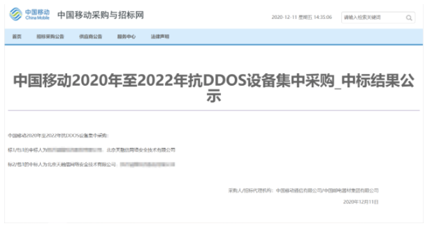 2020Äê12ÔÂ11ÈÕ£¬£¬ÖйúÒÆ¶¯¶ÔÍâÐû²¼ÁË2020ÄêÖÁ2022Ä꿹DDoS×°±¸¼¯ÖвɹºÖбêЧ¹û£¬£¬×¯ÏÐÓÎÏ·Òì³£Á÷Á¿ÖÎÀíÓ뿹¾Ü¾øÐ§ÀÍϵͳ£¨TopADS£©»®·ÖÒÔ30%·Ý¶î£¨°ü1£©¡¢70%·Ý¶î£¨°ü2£©È«±ê¶ÎÖбꡣ¡£
