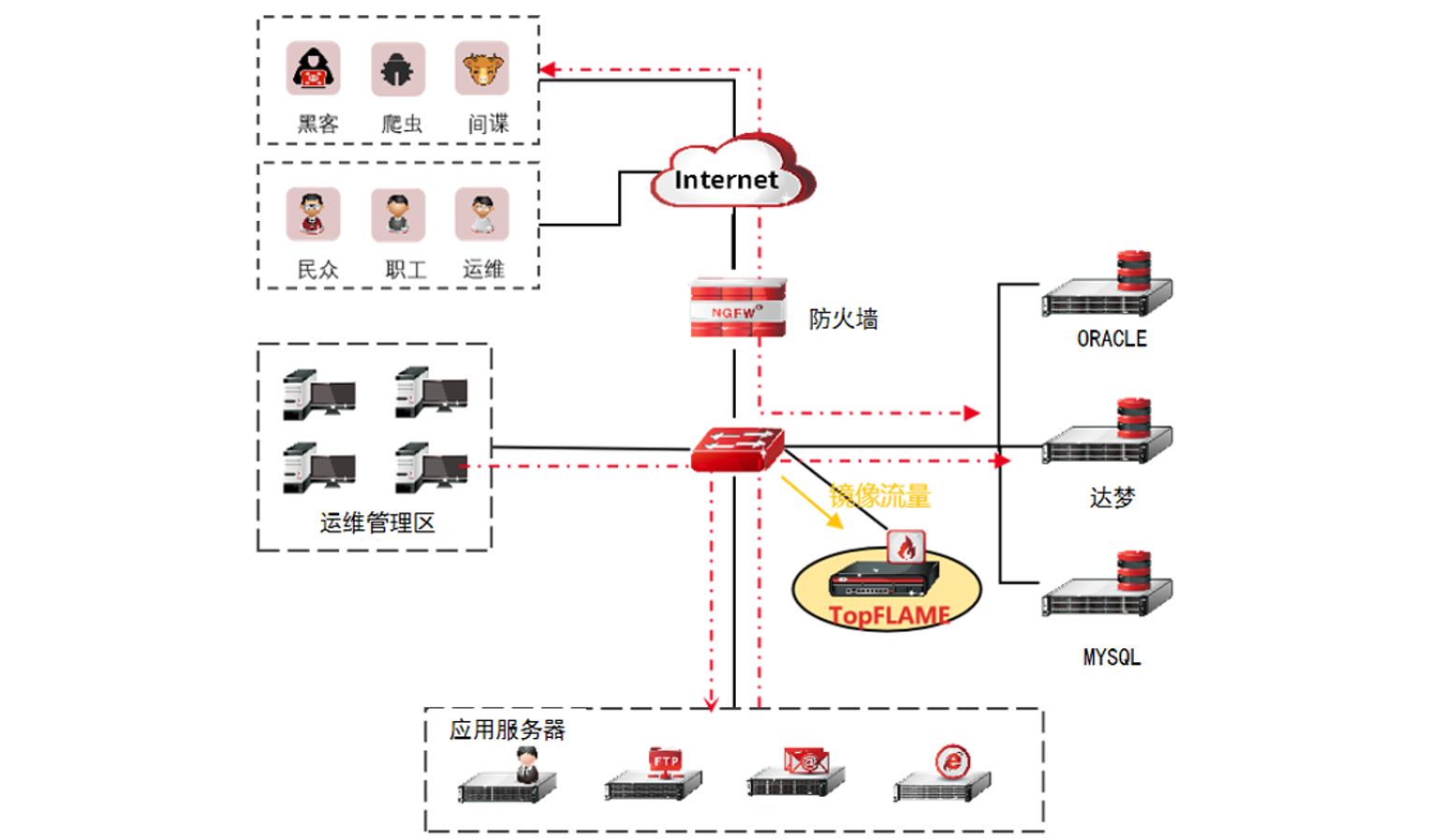 ÅÔ·°²ÅÅÊÇ×î³£¼ûµÄ°²ÅÅ·½·¨£¬£¬£¬½«TopFLAMEÅÔ·°²Åŵ½Ä¿µÄÍøÂçÖУ¬£¬£¬¼àÌý¾µÏñÁ÷Á¿£¬£¬£¬¾ÙÐÐÆÊÎöÆÊÎö£¬£¬£¬ÖÜÈ«¼ì²â ¡£ ¡£ÅÔ·°²ÅÅÍØÆË¼òÆÓ£¬£¬£¬²»¸Ä±äÔ­ÓÐÍøÂç½á¹¹£¬£¬£¬ÏµÍ³ÉÏÏßÀû±ã¿ì½Ý£¬£¬£¬±»¶¯¼àÌý¾µÏñÁ÷Á¿¼´¿ÉʵÏÖÍþв¼ì²â ¡£ ¡£